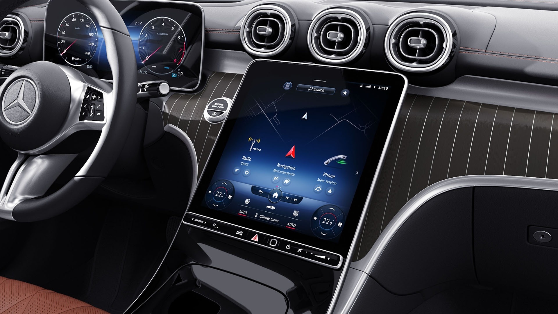 В центре приборной панели универсала С-Класса расположен крупный сенсорный дисплей с высоким разрешением и отличным качеством изображения. Он выполнен в портретной ориентации, имеет гладкую стеклянную поверхность и направлен к водителю, что упрощает управление автомобилем. Портретной ориентацией особенно удобно пользоваться, когда речь идет о навигации.
