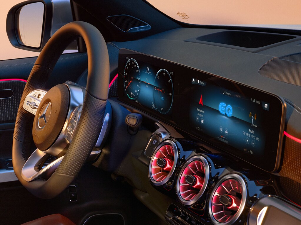 Салон Mercedes-Benz EQB сохраняет традиционное внимание Mercedes-Benz к деталям, но дополняет его современными технологиями. На центральной панели расположена мультимедийная система MBUX с широкоформатным экраном, интегрированным с виртуальной приборной панелью. Голосовое управление и сенсорные элементы позволяют водителю сосредоточиться на дороге, а адаптивная подсветка с 64 цветами создает индивидуальную атмосферу.